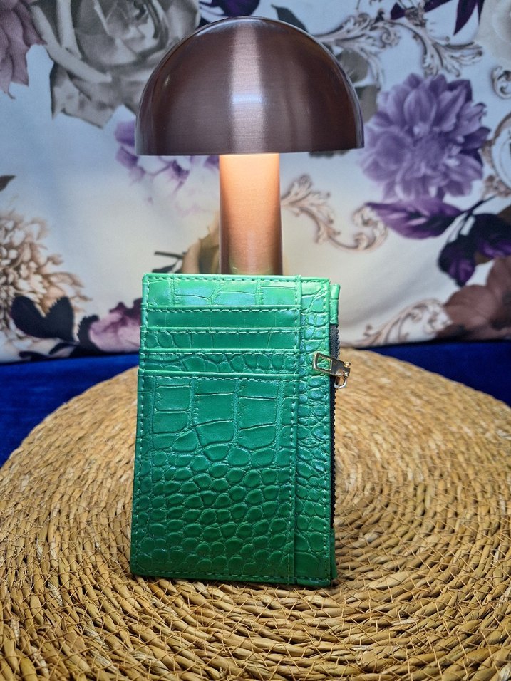 Parlak yılan derisi desenli yeşil deri kadın cüzdanı, fermuarlı bölmesiyle güvenli kullanım sağlar. Günlük kullanıma uygundur.