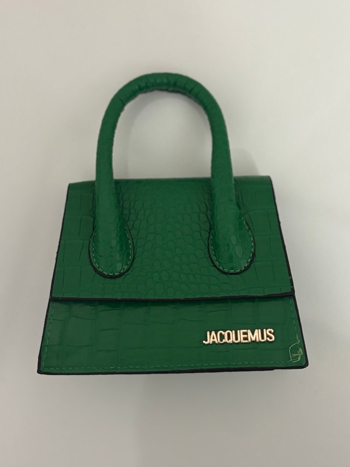 Yılan derisi desenli, tokalı yeşil deri kadın çantası. JACQUEMUS logosu bulunur, koyu canlı renktedir ve sokak modasına uygundur.