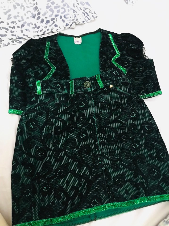 Dar kesim kız bolero, koyu yeşil yılan derisi deseni ve dantel detaylara sahiptir. Sentetik kumaştan, kısa kollu, V yakalı ve goth tarzında, yeşil simli süslemelidir. 7 beden arka tarfta hafıf sola var bolera boy 24 en 40 etek boy 30en 34 cm