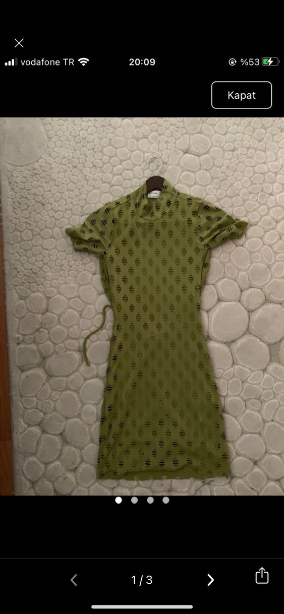 Dar kesim uzun triko elbise, koyu yeşil yılan deseni ve dantel detaylara sahiptir. Kısa kollu ve yüksek yakalı, yumuşak sentetik kumaştan üretilmiştir.