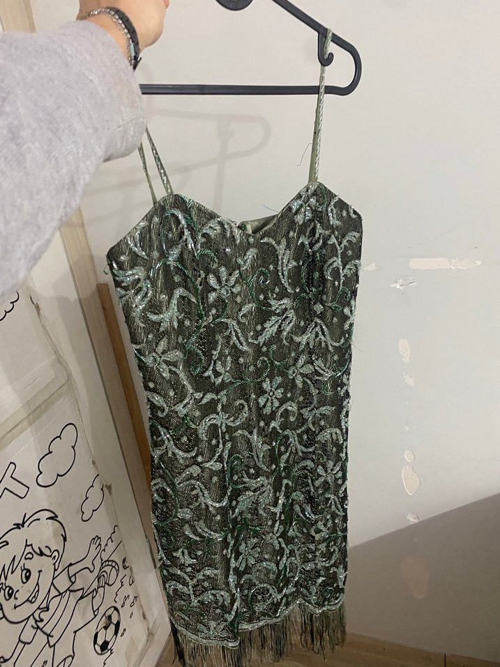 Yeşil yılan desenli, drapeli ve askılı, bohem tarzda midi boy gece elbisesi. Parti için uygun, vücuda oturan kesim. Abiye