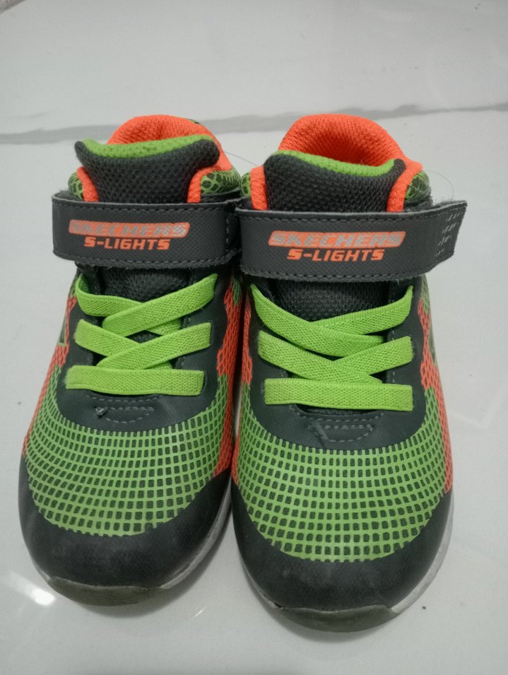 Yeşil yılan desenli, renkli erkek çocuk spor ayakkabısı, kaydırmaz taban ve cırt cırtlı kapanışa sahiptir. ışıklari yanıyor.
