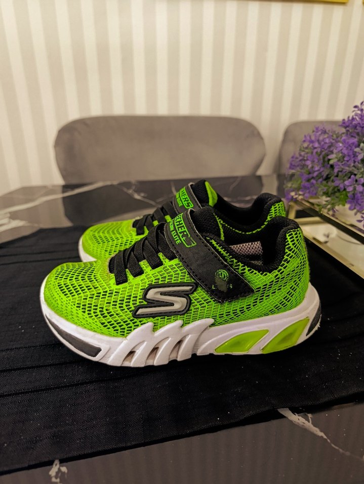 Erkek çocuklar için yeşil yılan desenli, renkli spor ayakkabılar. Kolay kapanan velcro bant ve dayanıklı kauçuk taban ile sokak stiline uygun.29 numara ışıkları yanmıyor
