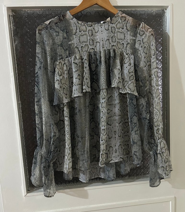 Yeşil yılan desenli bluz, uzun kollu, yüksek yakalı ve bol, transparandır iç gösterir.