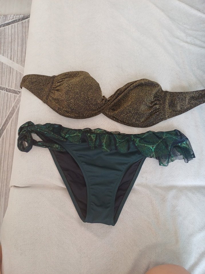 Koyu yeşil yılan deseni ve fırfır detaylı, ince askılı, vücuda oturan mini bikini. Bohem tarzda plaj için uygun.