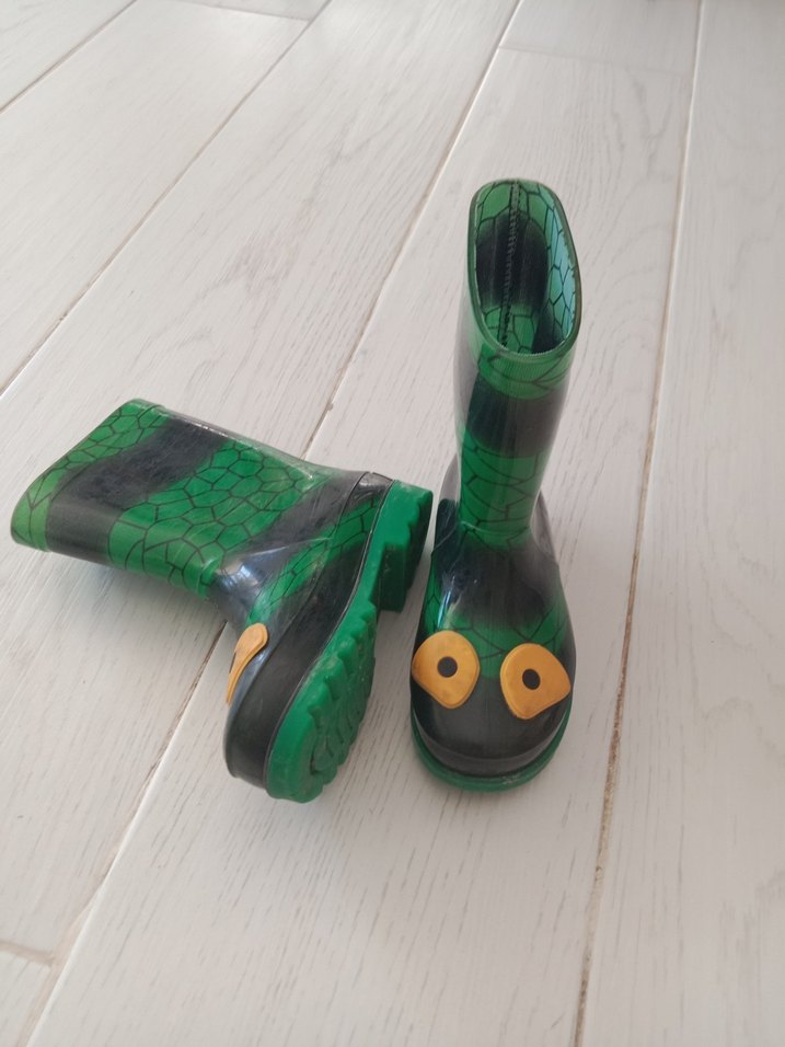 Yılan desenli, tokalı yeşil renkli lastik çocuk çizmesi, bohem tarz için uygundur.