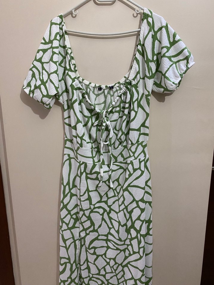 Etikette S yazıyor ama M benden için uyumlu Yılan desenli, yeşil renkli mini elbise, tekne yaka ve kısa kollu. Dantel bağcıklı ve yumuşak sentetik kumaştan, sokak modası için uygun.