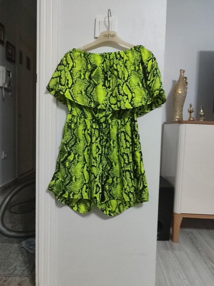 Renkli yeşil yılan desenli, straplez ve kısa kollu mini tulum. Yumuşak sentetik kumaştan, bol kesim ve fırfır detaylıdır.