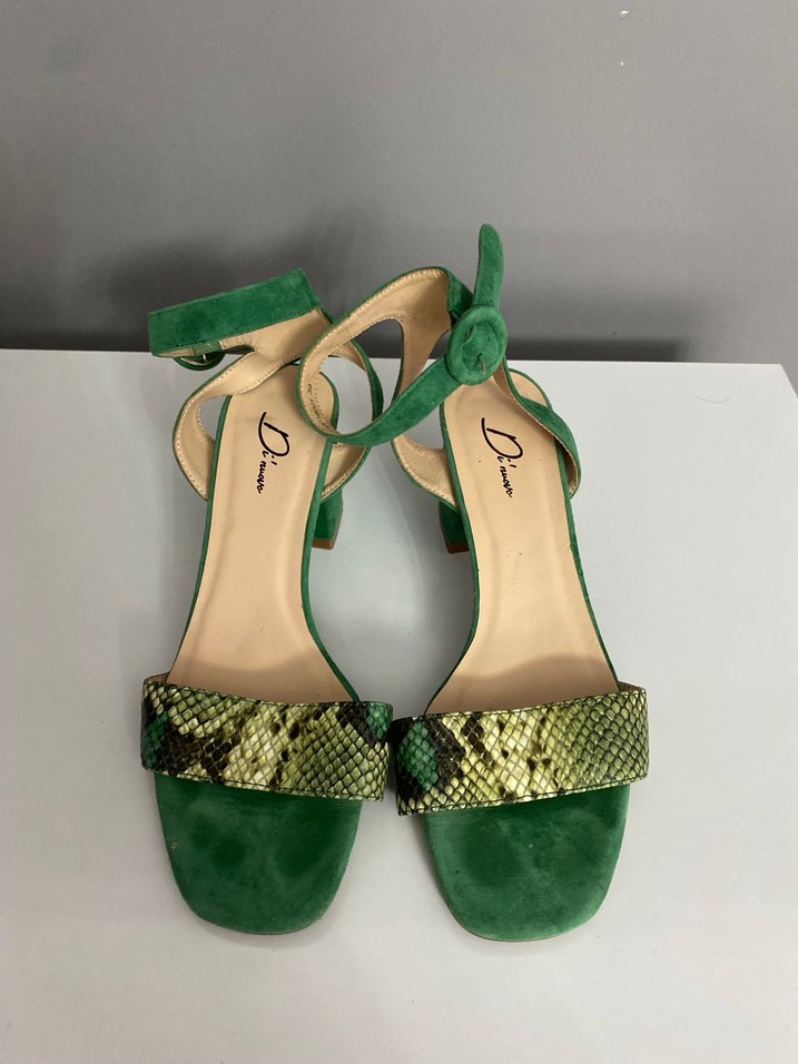 Yeşil süet malzemeden, parlak yılan desenli bantlı ve tokalı bilek kayışlı kadın topuklu ayakkabı, romantik akşamlar için ideal.
