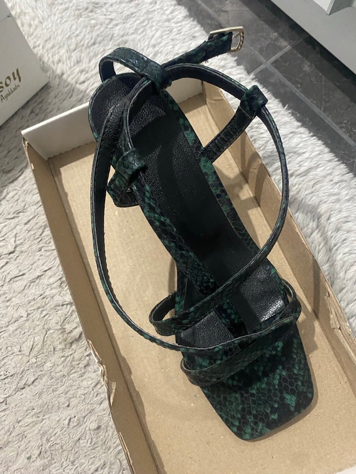 Yeşil yılan desenli, tokalı bantları olan stiletto topuklu sandaletler, kauçuk malzemeden üretilmiştir ve günlük kullanıma uygundur.