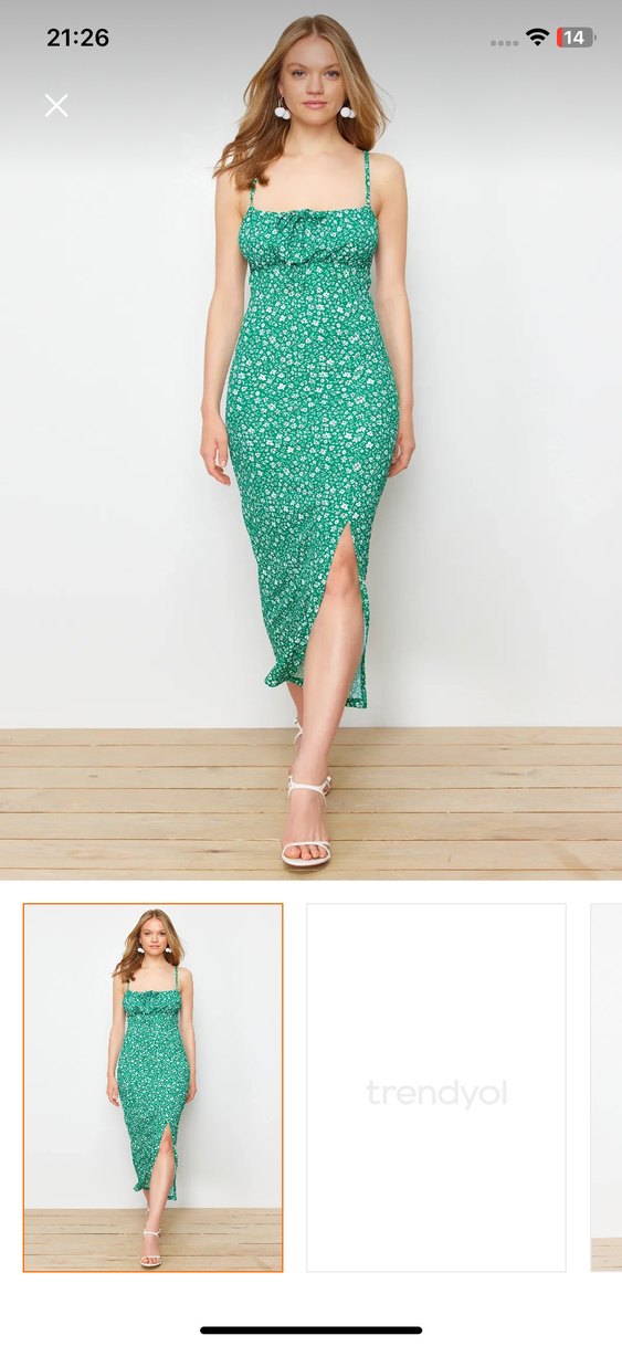 Yeşil renkte, yılan desenli uzun elbise. Straplez yaka ve drapeli detaylara sahip, vücuda oturan kesim. Ön kısmında yırtmaç bulunur, sentetik kumaştan üretilmiştir. Romantik akşamlar için uygundur.