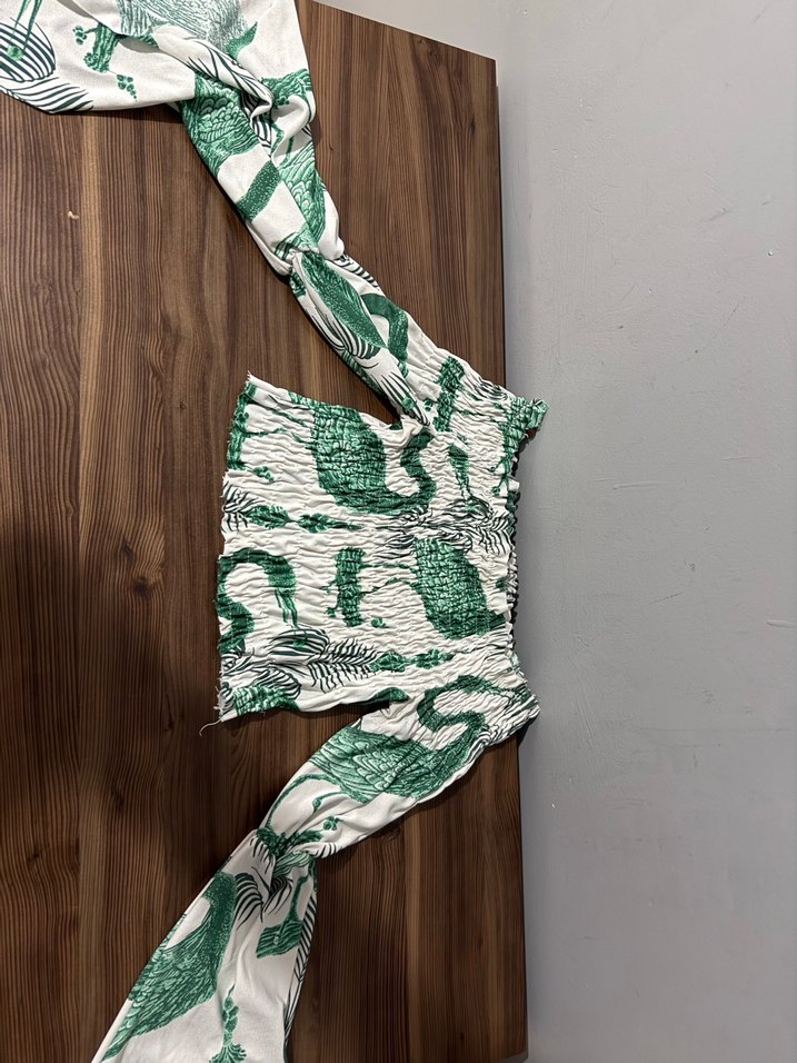 Koyu yeşil yılan desenli, tekne yaka ve uzun kollu, vücuda oturan bluz. Yumuşak sentetik kumaştan yapılmış, pilili ve uzun kesimli, bohem tarzda.