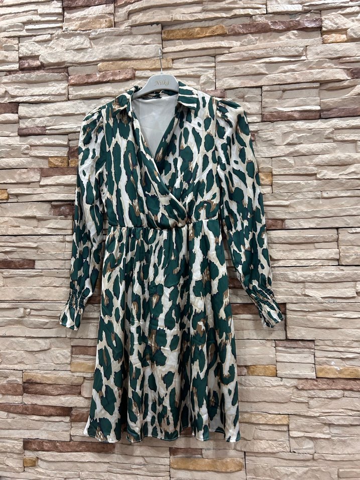 Yılan desenli, uzun kollu, V yakalı, bol kesim ve kemerli uzun elbise. Sentetik kumaştan, rahat ve şık bir dış mekan görünümü için uygundur. Bir iki defa giyildi sorunsuz