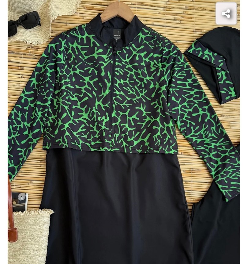 Sentetik kumaştan, yeşil yılan desenli, uzun kollu ve fermuarlı, balıkçı yaka, dar kesim mayo, belden daraltma ipi de mevcuttur ürün bir kez kullanıldı 3 xl ama 40 42 beden bile giyebilir belden büzgülü ipli olduğu için