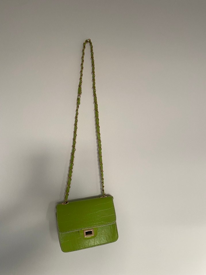 Yeşil yılan desenli deri çanta, zincir detaylı ve günlük kullanıma uygun minimalist tasarıma sahip.