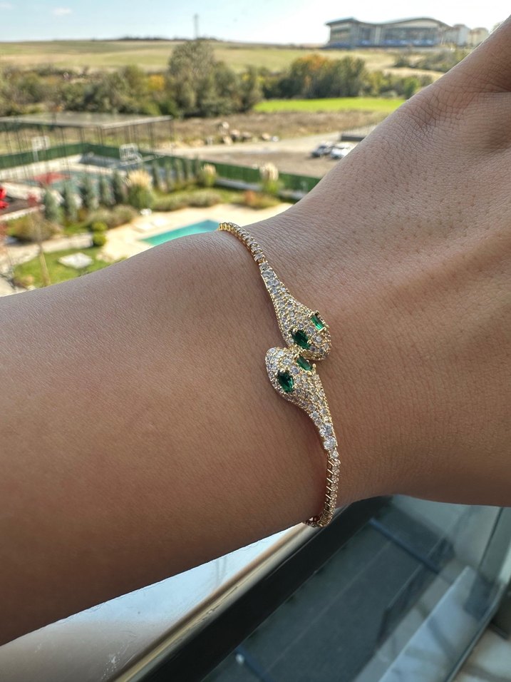Parlak yeşil yılan desenli, zincir detaylı kadın bileklik, sokak tarzı ve klasik zarafeti bir arada sunar.