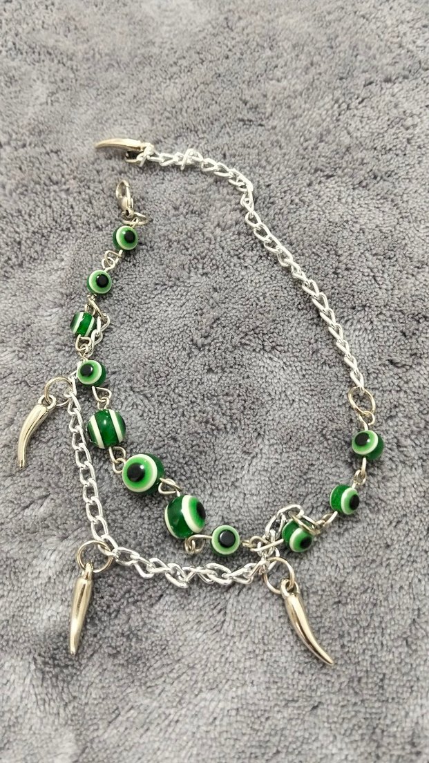 Parlak yeşil yılan desenli boncuklar ve detaylı zincirlerle kadın el zinciri, goth ve grunge punk tarzında rock punk havası taşıyor.