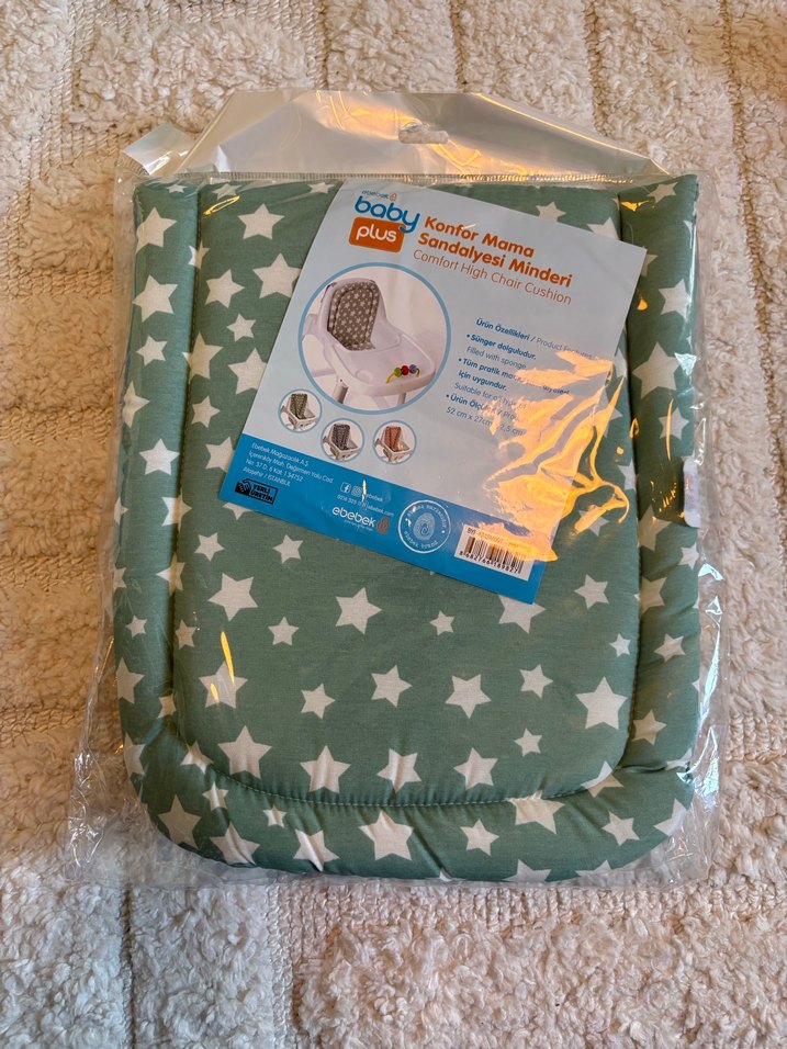 Pastel yeşil renkte, yıldız desenli, yumuşak ve sıcak kumaştan yapılmış bebek sandalyesi minderi. Çocuklar için rahat oturma sağlar. ⭐
