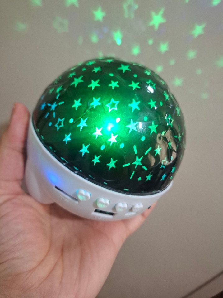 bluetooth bağlantısı hoparlör özelliği vesaire hepsi mevcuttur Sadece üst deseninde bir çatlak oluştu bantla tutturdum hiçbir problem oluşturmuyor Kullanıma renkli yıldız desenleri yansıtan gece projektörü, duvar ve tavanlarda huzurlu bir ortam yaratır. USB girişli ve çok tuşludur.