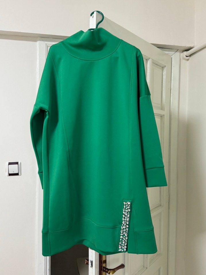 Yeşil renkte, yüksek yakalı ve uzun kollu, bol kesim tunik . Drapeli tasarımı ve midi boyu ile yumuşak, sıcak kumaştan üretilmiştir.Scuba kumaştan üretilmiş pantolon İspanyol paça beli lastiklidir