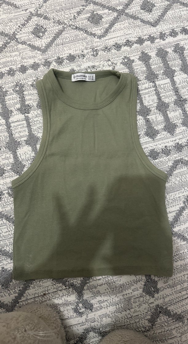 Yeşil renkli, yüksek yakalı ve kolsuz, vücuda oturan kadın atlet. Düz ve midi boyda, günlük kullanım ve sokak stili için uygun.
