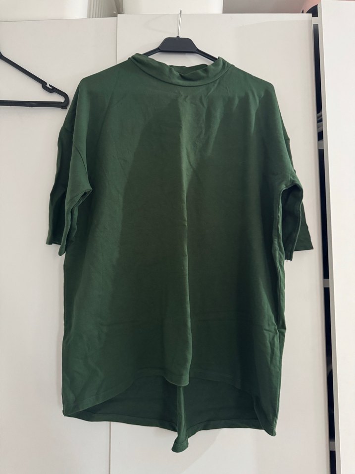 Yüksek yakalı, kısa kollu ve keten kumaştan yapılmış yeşil renkli, salaş kesim kadın tişörtü. Minimalist ve rahat şıklık sunar, günlük kullanıma uygundur.