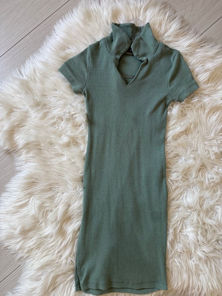 Yumuşak sentetik kumaştan, yüksek yakalı ve kısa kollu yeşil kısa vücuda oturan elbise. Sade tasarımıyla rahat ve şık bir günlük sokak stili sunar.