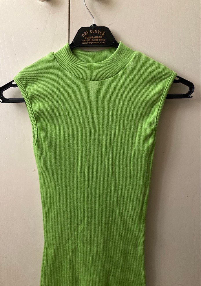 Kolsuz, yüksek yakalı ve yün örme bu kadın elbise, parlak yeşil renkte ve midi boyda, günlük kullanım için minimalist sokak stiline uygundur. Vücudu sarar bir kez giyildi