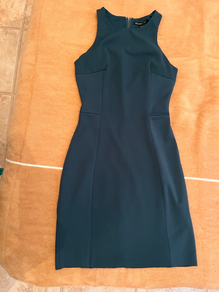 Yeşil renkli, yüksek yakalı ve kolsuz mini elbise, vücuda oturan kesimi ve arkada fermuar detayıyla dikkat çekiyor.