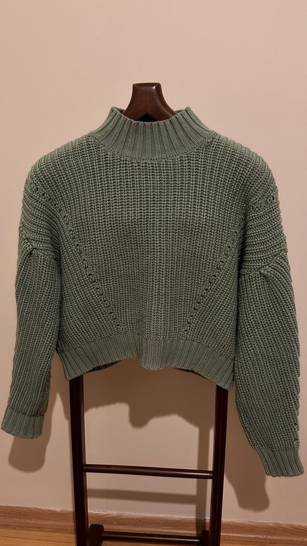 Yeşil renkli, yüksek balıkçı yakalı ve uzun kollu örgü kadın kazak. Rahat kesimi ve normal boyu ile günlük kullanıma uygundur.