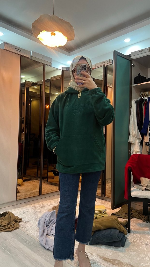 Yeşil renkte, yüksek yakalı ve uzun kollu salaş kesim sweatshirt. Yumuşak ve sıcak kumaştan üretilmiş, günlük kullanım için rahat ve şık bir tercih.