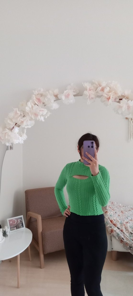 Fitted kesim, yüksek yakalı ve uzun kollu yeşil triko kazak. Orta boyda ve rahat dokulu, günlük kullanıma uygun. göğüs dekolteli ama çok derin değil