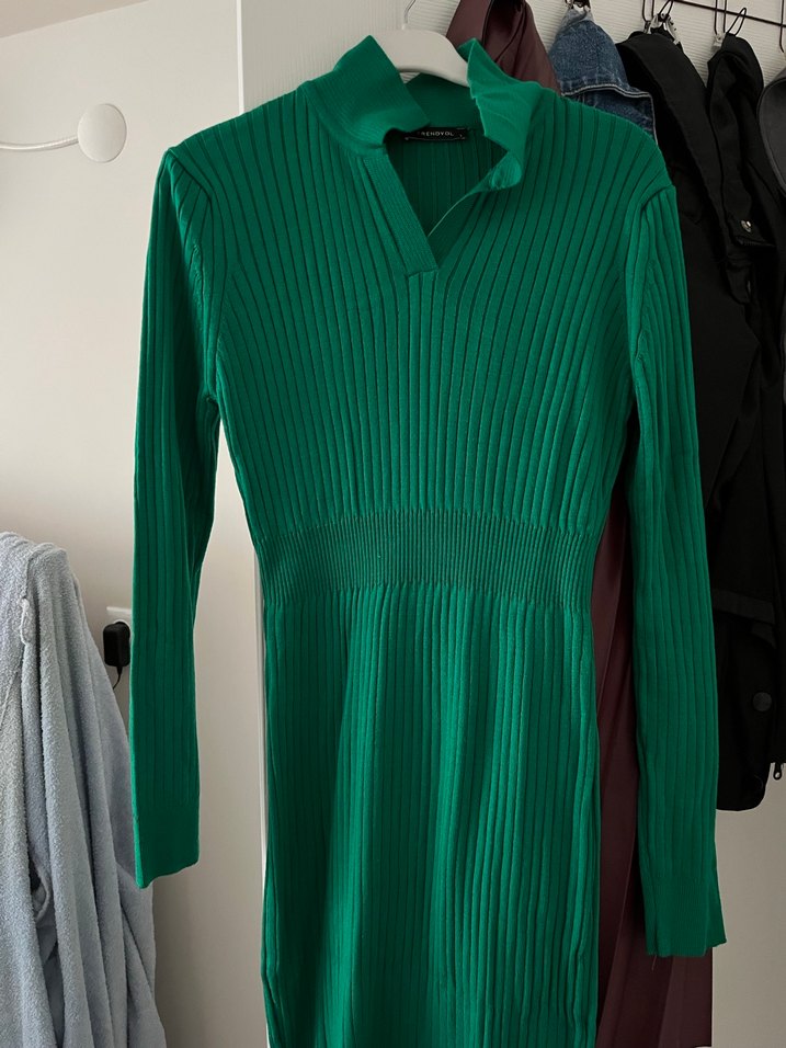 Yeşil renkli, yüksek yakalı ve uzun kollu triko elbise. Sentetik kumaştan, vücuda oturan kesimde ve midi boyda, günlük kullanıma uygun.