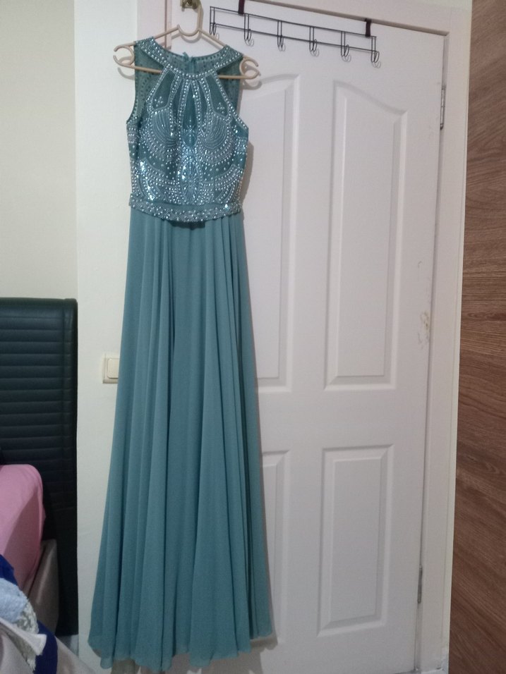 Su yeşili renkli, yüksek yakalı ve drapeli detaylara sahip uzun abiye elbise. Kolsuz boyundan ve desenli üst kısmıyla düğünler için uygun klasik şıklık sunar. sadece 2 saatliğine giydim ağır bir abiyedir. hafif bir abiye değildir eteği bile 4 kat tülden oluşuyor. Uçuş uçuştur. etek uçlarında deformasyon dahi yoktur fitrinden alınmış gibidir. 40 Beden olduğuna aldanmayın. Dar kaliptir. 60 kilogramda giydim ölçüleri içinde yazınız.