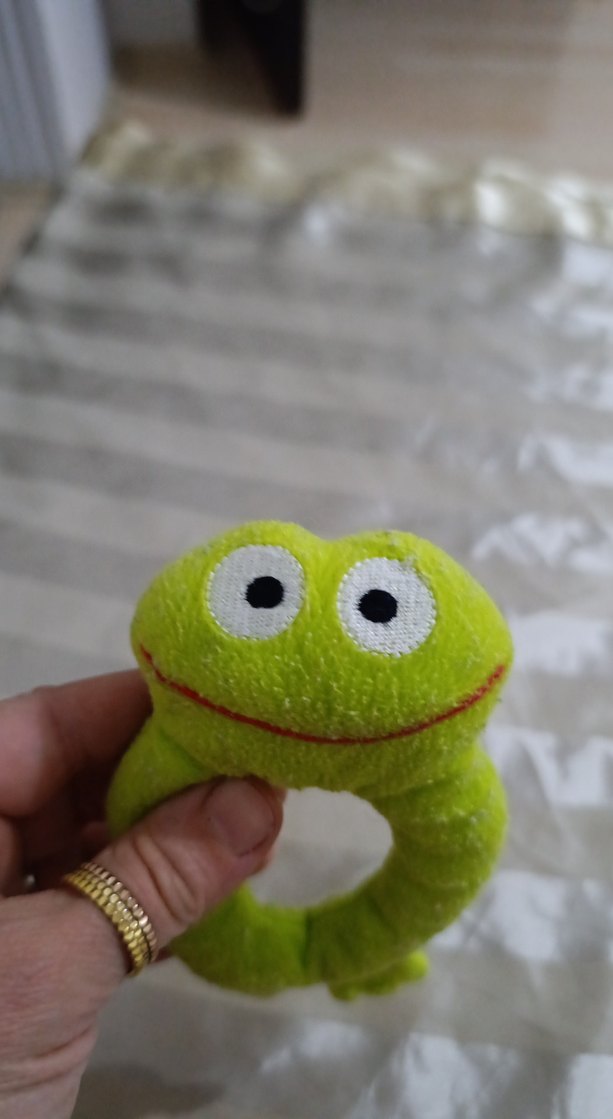 Yumuşak ve renkli yeşil kurbağa peluş oyuncak, gülen yüzüyle sarılmak ve oynamak için uygun.