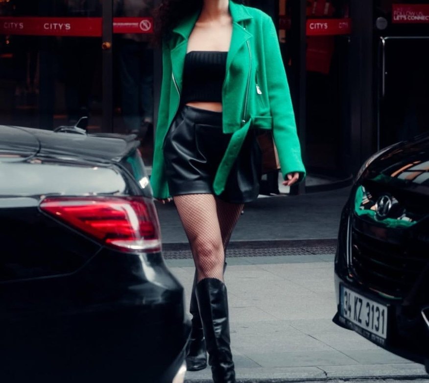 Kemerli, koyu yeşil yünlü polo yaka kısa çeket