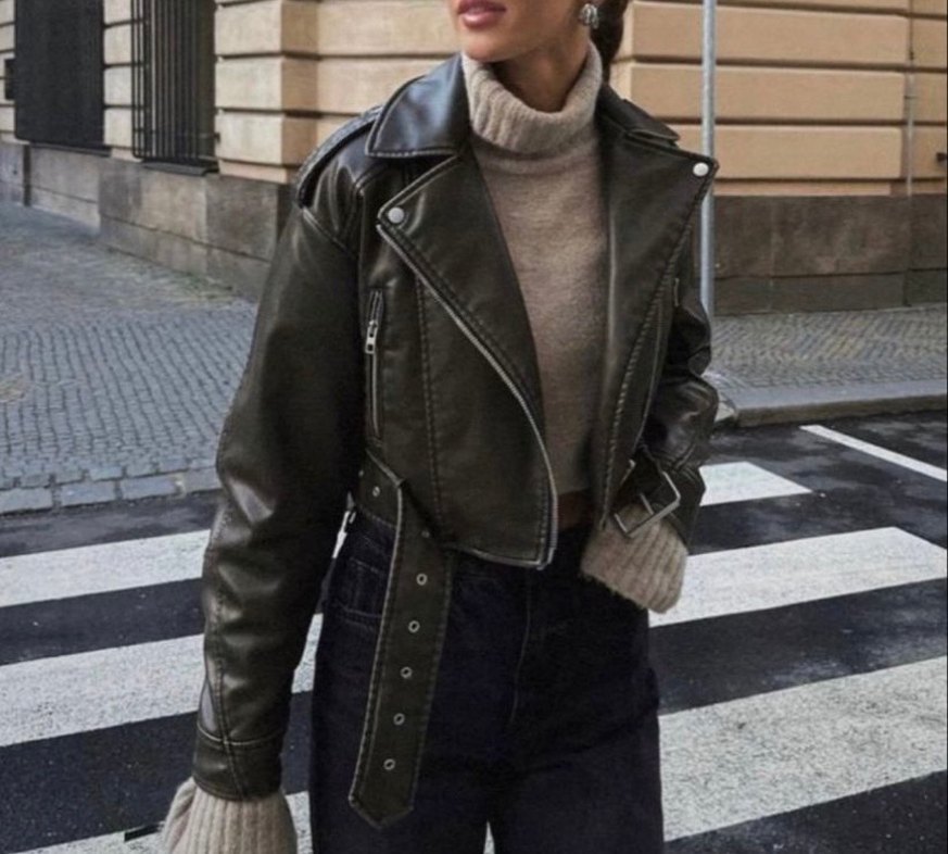 Yeşil ZARA Kemerli Biker Deri Ceket