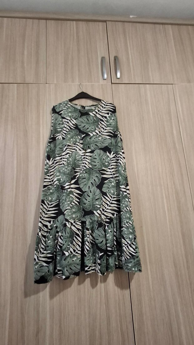 Yeşil yaprak ve zebra desenli, kolsuz midi elbise. Yumuşak sentetik kumaş, bol kesim ve pile detaylara sahip, bohem tarzda. etiket s,m ama 38,ve 40 bedene uyumlu.