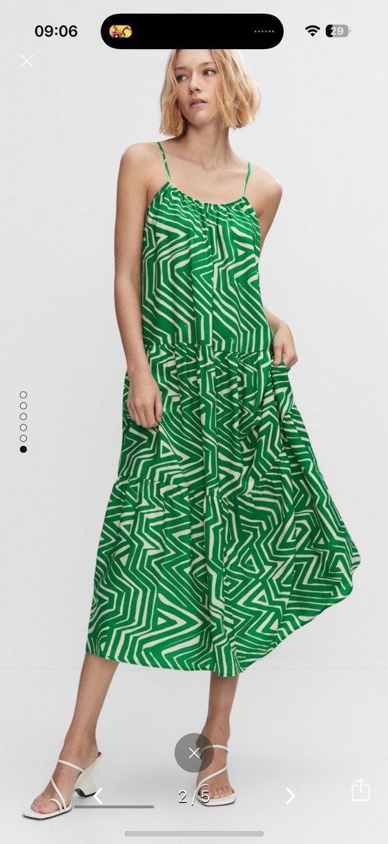 Yeşil zebra desenli uzun, askılı ve pileli elbise, bol kesim ve yumuşak sentetik kumaştan yapılmıştır. Günlük kullanıma uygun çağdaş ve avangart bir tarza sahiptir.
