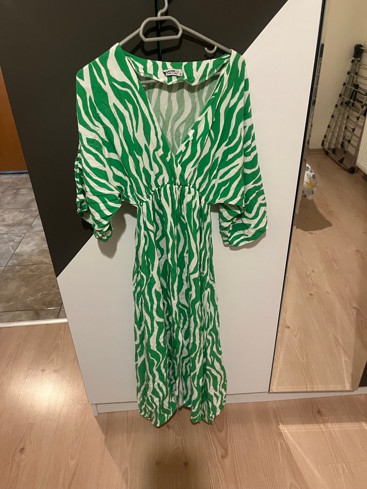 Yeşil zebra desenli, bol kesim, drapeli ve kısa kollu uzun bohem elbise. V yaka detaylı, hafif desenli, dış mekan için uygun bir model.