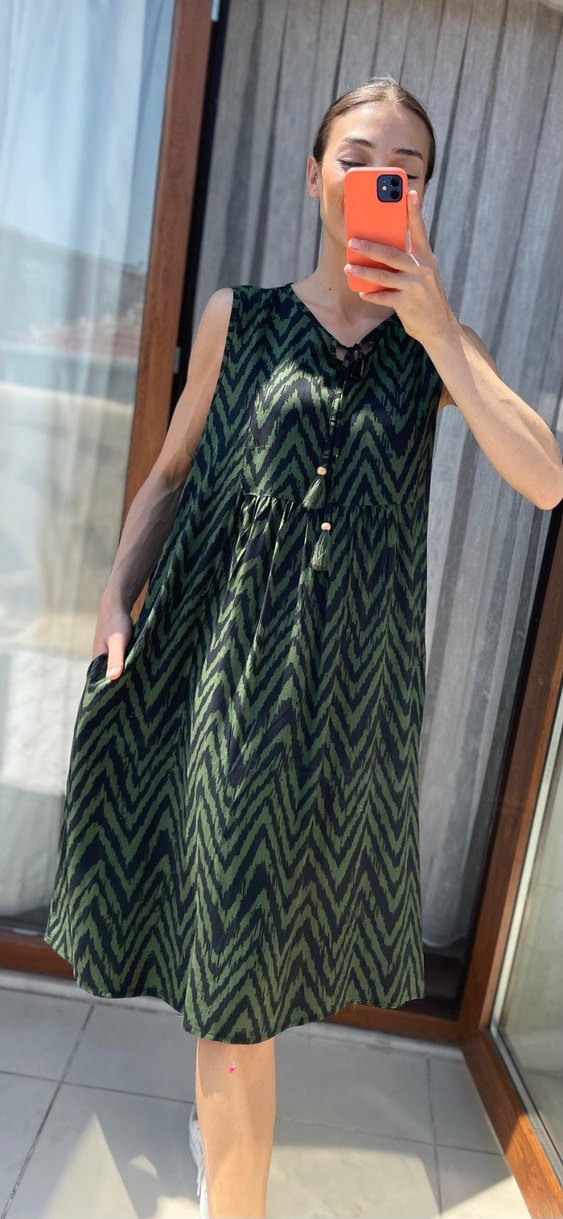 Yeşil zebra desenli, V yakalı ve kolsuz uzun elbise. Rahat kesimli, pile detaylı ve yumuşak sentetik kumaştan üretilmiştir.