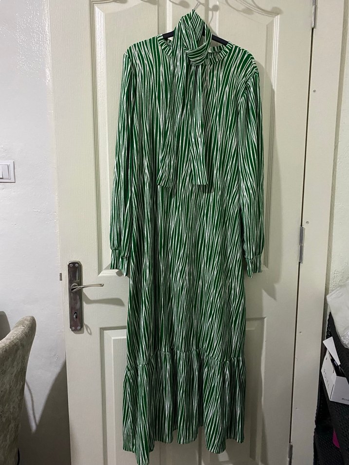 Bu uzun yeşil elbise, parlak zebra deseni, pilili kumaş, uzun kollar ve yüksek yakaya sahiptir. Bol kesimi ve bohem tarzıyla dikkat çeker. S-M bedene uygundur.