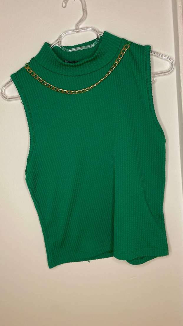 Yeşil renkli, yüksek yakalı ve kolsuz örme süveter. Parlak zincir detayı ve midi boyuyla günlük sokak stiline uygundur.