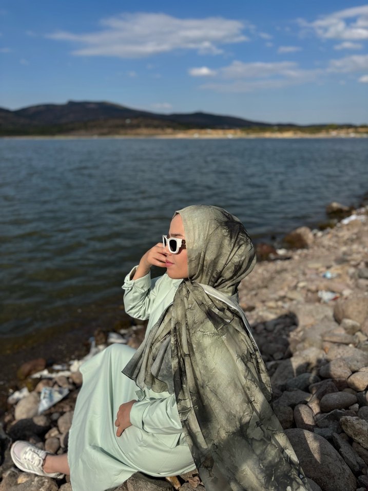 Gri keten kumaştan, bohem tarzda, drapeli kadın şalı. Doğal dokusu ve rahatlığıyla mütevazı bir şıklık sunar.