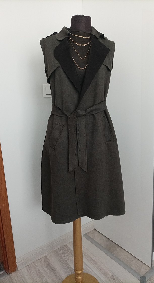 Uzun, kolsuz ve kemerli bu trençkot, yaka detayına sahip. Yumuşak süet kumaştan üretilmiş, bol kesim ve desensiz. Ofis için uygun yeşil süet renkte. boyu 92