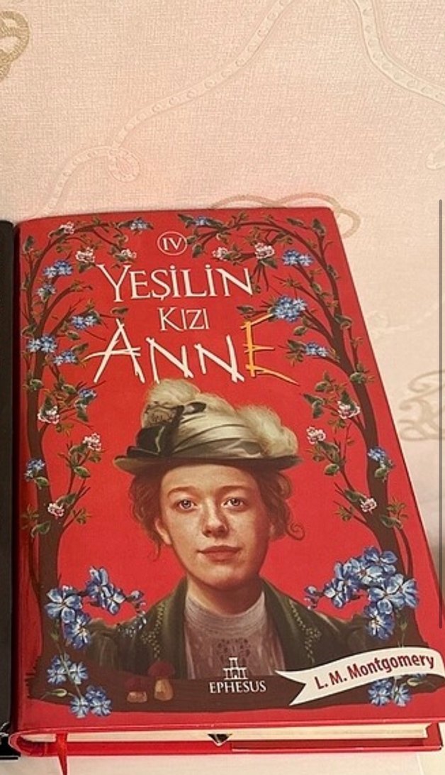 Ephesus yayınevinden L. M. Montgomery'nin 'Yeşilin Kızı Anne' adlı romanı. Kapakta çiçeklerle çevrili genç bir kadının portresi yer alıyor.