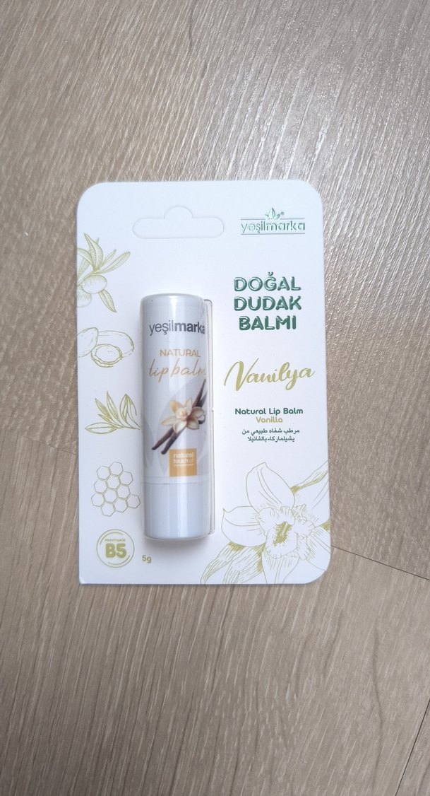 Yeşilmarka Vanilya Doğal Dudak Balmı, hafif bej tonunda, dudakları nemlendiren ve B5 vitamini içeren doğal bir bakım ürünüdür.