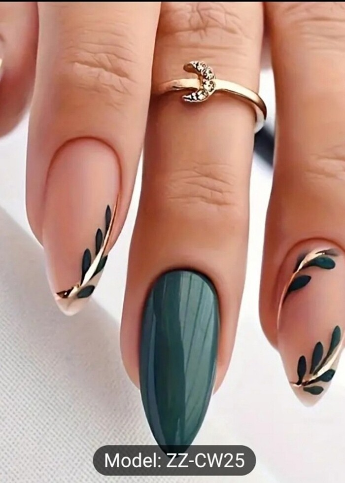 Yeşil yapraklı altın geçişli badem şeklinde 24 adet takma tırnak seti yapışkan bantları törpüsü ile kutusunda sıfır ürün gönderimi yapıyorum