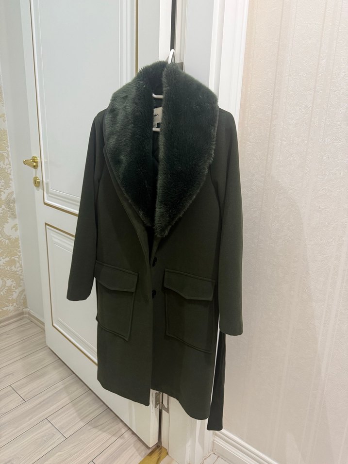 Yeşil kaban, yumuşak kürk yakası ve ön cepleri ile. Ayarlanabilir kemer detayı bulunur. Soğuk havalar için sıcak ve şık.