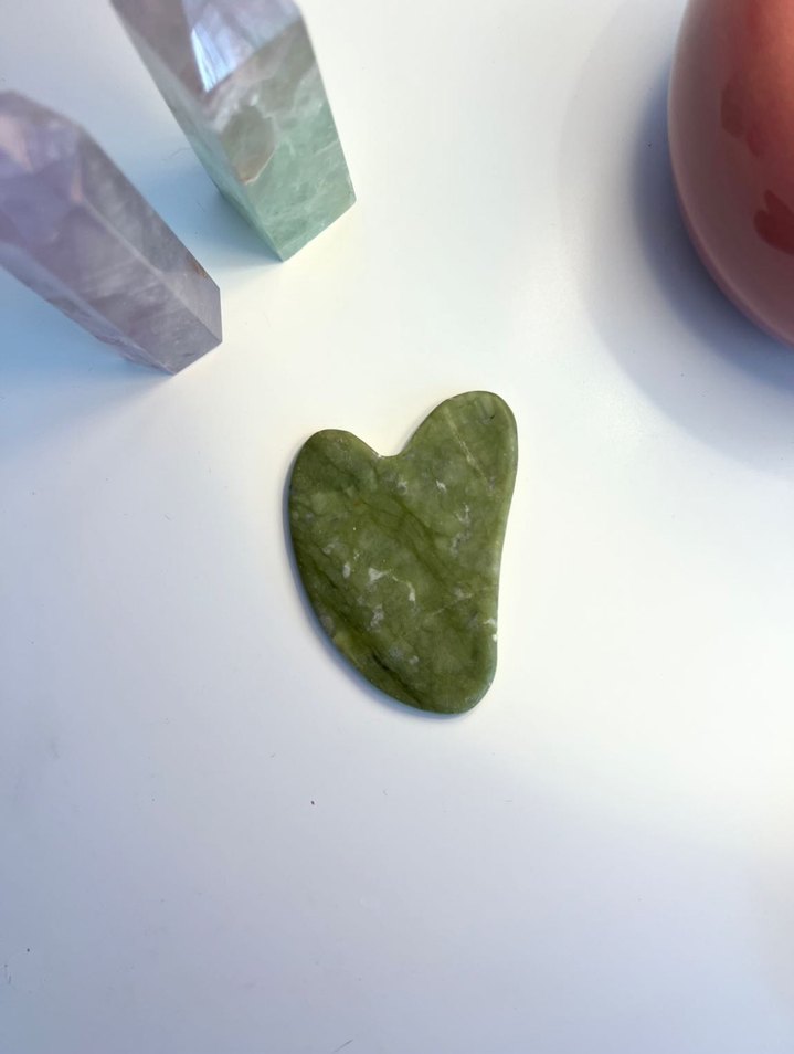 Doğal yeşim taşı Gua Sha. Düzenli kullanımda yüz kaslarını rahatlatır, kan dolaşımını destekler. Yüz yogasıyla birlikte şişkinliği azaltmaya ve cilt tonunu eşitlemeye yardımcı olur